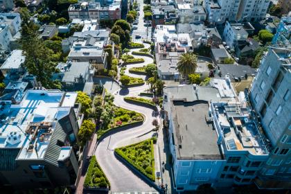 Lombard Street سانفرانسیسکو، 1440 درجه پیچ در مسیر شیب دار به طول 400 متر