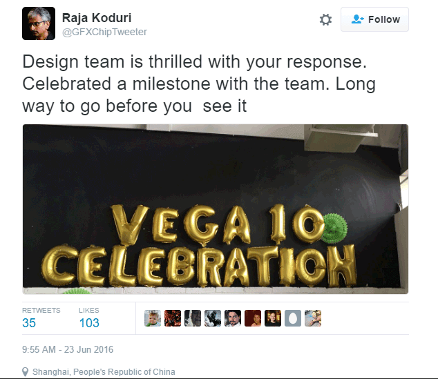 در ماه های گذشته،AMD تحت فشار کاربران و سیلیکون های قدرتمند انویدیا قرار گرفته و عرضه کارت گرافیک های مبتنی بر معماری VEGA را از اوایل سال 2017،به سال 2016 جلو انداخت.آقای Raja Koduri گفت:کارت گرافیک های ارزان قیمت و میان رده RX480/470/460 به زودی در بازار خواهند بود.با این حال،شرایط برای ورود یک کارت گرافیک پرچمدار به نام RX 490،آرام است.به نظر منظور ایشان از آرام،محیا بودن شرایط بوده است.کارت گرافیک RX490 بر اساس معماری VEGA تولید خواهد شد که معماری دقیق آن با نام VEGA 10 شناخته می شود.این معماری در کنار نسل دوم حافظه های HBM به نام HBM2 فعالیت خواهد کرد.با وجود آنکه VEGA در گذشته به منظور جایگزینی با پرچمداران فیجی (Fiji) طراحی شده بود،اما ظاهرا باید جای خالی خیلی از کارت گرافیک ها را برای AMD پر نماید.در نهایت عرضه RX490 به ماه اکتبر سال 2016 نقل مکان کرده است.توییت آقای Raja Koduri نیز مهر تائیدی بر این اطلاعات است.پس تا پایان سال 2016،حداقل دو کارت گرافیک دیگر به نام های GTX1060 و RX 490 روانه بازار خواهند شد.