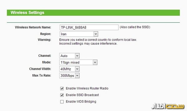 گزینه Region که البته نام ایران هم در میان آن دیده می شود، مربوط به قوانین و مقررات هر کشور در استفاده از کانال های مختلف در رابط بی سیم است. در برخی کشورها، به دليل تداخل امواج رادیویی یا موارد دیگر، استفاده از برخی کانال ها در باند 2/4 گیگاهرتز ممنوع شده است و در گزینه Region می توان با انتخاب هر کشور، کانال های مجاز به انتخاب را مشاهده کرد. گزینه Channel که به طور پیش فرض روی حالت Auto قرار دارد، فهرست کانال های موجود در باند 2/4 گیگاهرتز را نشان می دهد. کانال شش، یکی از مواردی است که در بيشتر اوقات توسط روترها انتخاب می شود و جزء شلوغترین کانالها به شمار مي رود. خوشبختانه سری جدید روترهای TP-Link از قابلیتی به نام Signal Sustain Technology بهره می برد که سعی دارد یک کانال خلوت را انتخاب کرده و میزان تداخل را به حداقل برساند. همچنین شما می توانید از نرم افزارهای مختلفی که هم برای کامپیوترها و هم برای گوشی های هوشمند طراحی شده، استفاده کرده و خلوت ترین کانال موجود در محیط را به صورت دستی انتخاب کنيد. گزینه Mode به نحوه پشتیبانی از استانداردهای مختلف 802.11 مربوط می شود. با انتخاب گزینه 11bgn mixed تمامی دستگاه های شما (حتی دستگاههای قدیمی که از گیرنده بی سیم با استاندارد 802.11g یا 802.11b) می توانند به روتر متصل شده و از آن استفاده کنيد. اگر همه دستگاه های شما از استاندارد 802.11n پشتیبانی می کنند، می توانید گزینه 11n Only را انتخاب کنيد. Channel Width به میزان پهنای باند کانال مربوط شده و دارای دو گزینه چهل مگاهرتز، بيست مگاهرتز و در برخی روترها Auto 20/40 MHz است. گزینه چهل مگاهرتز سرعت و کارایی سیگنال Wi-Fi را افزایش می دهد. اما این مسئله تنها در مواقعی مؤثر است که در فاصله خیلی دور از روتر قرار نگرفته باشید. در فاصله خیلی دور، سیگنال بسیار ضعیفتری در اختیار داشته و کارایی به شدت افت خواهدکرد.