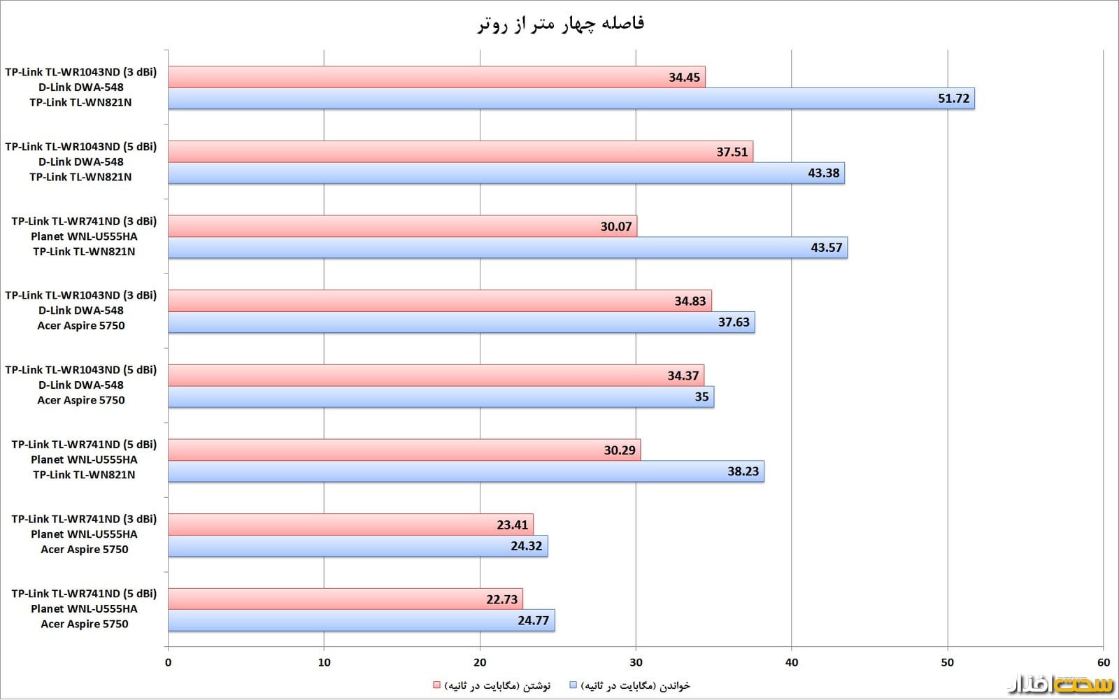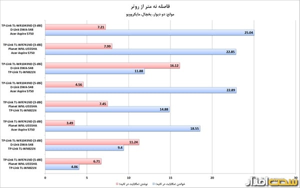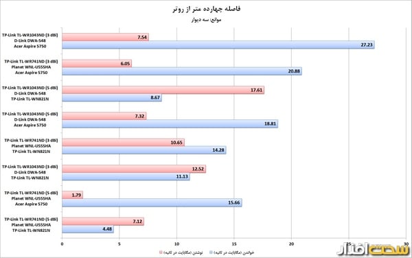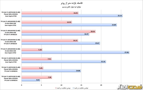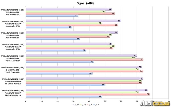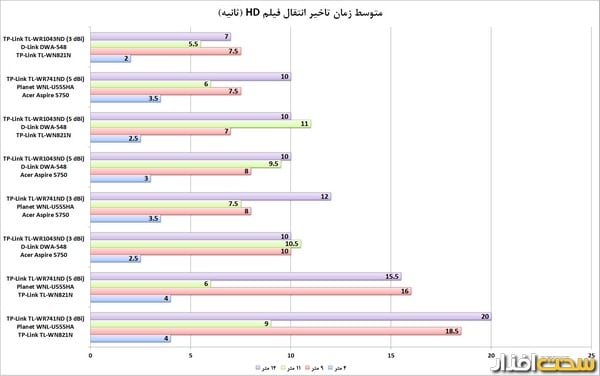 همانطور که از نمودار نتایج سیگنال مشخص است، آنتن های قویتر در ایجاد سیگنال های قویتر و باثباتتر نقش مهمی دارند و به واسطه سیگنال بهتر، می توان انتظار کسب کارایی بهتري داشت. این مسئله در فاصله نزدیک چندان مشهود نیست و گیرنده TP-Link در فاصله نزدیک توانسته با سرعت بالا اطلاعات را منتقل کند. اما با افزایش موانع و فاصله، علاوه بر افت سیگنال شاهد کاهش سرعت در انتقال اطلاعات نیز هستیم. طبق نمودار سیگنال به این نتیجه می رسیم که، اگر قرار است در فاصله ای به نسبت دور از روتر قرار بگیرید، بهتر است از گیرندهای مجهز به آنتن خارجی استفاده کنید. ثبات و قدرت سیگنال به توجه به موانع و فاصله در سطحی به نسبت مناسب قرار دارد. استفاده از آنتن پنج دسی بلی باعث شده، قدرت سیگنال کمی بهبود یابد. نوت بوک آزمایش ما و سرور مرکزی با استفاده از فناوری dlna با یکدیگر در ارتباط هستند. به همین دليل، در فواصل مختلف و با توجه به موانع، امکان پخش فایل های موسیقی و فیلم های HD را نیز در فواصل مختلف بررسی کردیم. در زمان استفاده از هر دو روتر در حالت های مختلف امکان انتقال فیلم HD و موسیقی وجود داشته و تنها مقداری زمان صرف بافر کردن اطلاعات می شود. استفاده از گیرنده Wi-Fi داخلی نوت بوک به دليل داشتن آنتن باعث شده، این زمان به میزان قابل توجهی کاهش یابد.