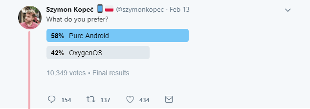 Szymon Kopeć یکی از مهندسان شرکت وان پلاس از کاربران توئیتر پرسید که از میان اندروید خام و OxygenOS کدامیک را ترجیح میدهند؟ در ابتدای کار نظرسنجی خیلی خوب و به نفع رایط کاربری وان پلاس پیش رفت و همین موضوع باعث گل کردن حس شوخ طبعی کارل پی، یکی از بنیانگذاران این شرکت و مدیرعامل فعلی شد. او به شوخی و با کنایه به شیائومی در پاسخ به نظرسنجی مهندس وان پلاس گفت: “این نظرسنجی را پاک نکن.” مطمئناً زمانی که در حال نوشتن چنین جمله ای بود، از برد اکسیژن OS مطمئن بود، اما غافل از اینکه این داستان پایان خوشی نداشت.