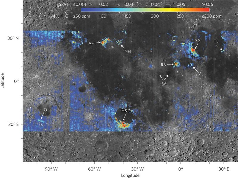 دانشمندان نمونه ای از سنگ های قمری را که حاوی دانه های کوچک شیشه ای از آب هستند را مورد بررسی قرار دادند. این دانه ها میلیاردها سال قبل، زمانیکه مواد آلی از درون ماه فوران کرد، تشکیل شدند و آب به درون آنها نفوذ کرد. دانشمندان اطلاعات ماهواره ای که توسط فضاپیمای هندی که به دور ماه میگردد را برای کشف اینکه این دانه های شیشه ای حاوی آب قرار گرفته اند، بررسی کردند. نتایج این بررسی امروز در وبسایت Nature Geoscience منتشر شد که نشان میدهد دو نقطه داغ گسترده از مواد آتشفشانی در آنسوی قطب های ماه وجود دارند که منبع غنی از آب هستند.