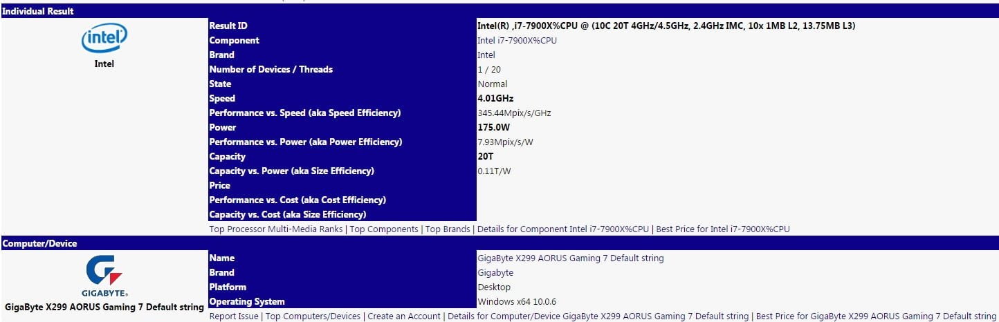 و اما پردازنده ی 10 هسته ای i9 7900X که به علت اشتباه سیستمی در اسلاید Core i7 نامیده شده است، دارای فرکانس موثر 4.0 گیگاهرتز در حالت پایه و 4.5 گیگاهرتز در وضعیت افزایشی است. اسلایدی که در پایگاه داده این وب سایت منتشر شده است، نشان می دهد که این پردازنده بر روی یک مادربرد X299 Gigabyte AORUS Gaming 7 فعال شده است. حافظه کش L3 در این CPU برابر با 13.75 مگابایت است. هر هسته در کش L2 دارای 1 مگابایت حافظه مجزا است که در نهایت می شود 10 مگابایت حافظه کش L2. توان حرارتی آن نیز 175 وات است. Skylake-X i9 7900X دارای قابلیت اورکلاک نیز خواهد بود.