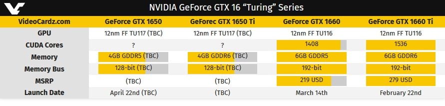این اطلاعات که از سازندگان کارت گرافیک بدست آمده است، تائید می کند که کارت گرافیک NVIDIA GeForce GTX 1650 در تاریخ 22 آوریل، راهی بازارهای جهانی می شود. دلیل تاخیر ورود آن نیز انتظار برای تخلیه ی مدل هایی نظیر GTX 1050 بوده است. این محصول دارای یک رابط 128 بیتی است. از سوی دیگر اما برخی از اطلاعات به یک مدل دیگر نیز اشاره می کنند؛ کارت گرافیک GTX 1650 Ti که به واقع جایگزین GTX 1050 Ti در نسل قبلی بوده و در حال حاضر نیز در بازار موجود است. این کارت گرافیک نیز دارای 4 گیگابایت حافظه GDDR5 بوده اما تاریخ عرضه رسمی آن و دیگر اطلاعات، ناشناحته باقی مانده است.