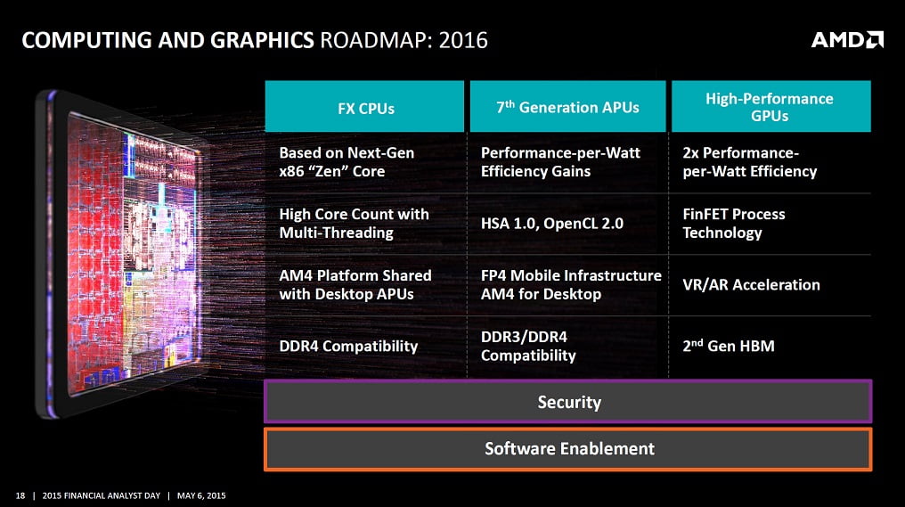 AMD پس از آن به معرفی برخی از اطلاعات پلتفرم جدید خود پرداخت.این کمپانی اعلام کرد که بر خلاف گذشته این بار سنت شکنی کرده و از یک سوکت برای پذیرایی از APU و پردازنده های معمولی خود استفاده خواهد کرد.این مورد از مهمترین امکانات AM4 است که کاربران را از شر سوکت های پراکنده راحت خواهد ساخت.AMD مجددا به پشتیبانی از فناوری DDR4 در حافظه های رم تاکید کرد و در ادامه به نام رمز Bristol Ridge برای APU ها و Summit Ridge برای پردازنده ها اشاره کرد.در پلتفرم AM4 تراشه ها در روش های FINFET های 14 یا 16 نانومتری پیاده سازی خواهند شد.طراحی هسته ها در پردازنده های ZEN یاد آوری معماری (Stars) است اما بسیار قدرتمند تر.علاوه بر آن حافظه های کش در این معماری مقدار بسیار زیادی تغییر را به همراه داشته است.پلتفرم AM4 در کنار APU/CPU های جدید این کمپانی و در نهایت یک کولر قدرتمند و کم صدا،در سال 2016 عرضه خواهد شد.