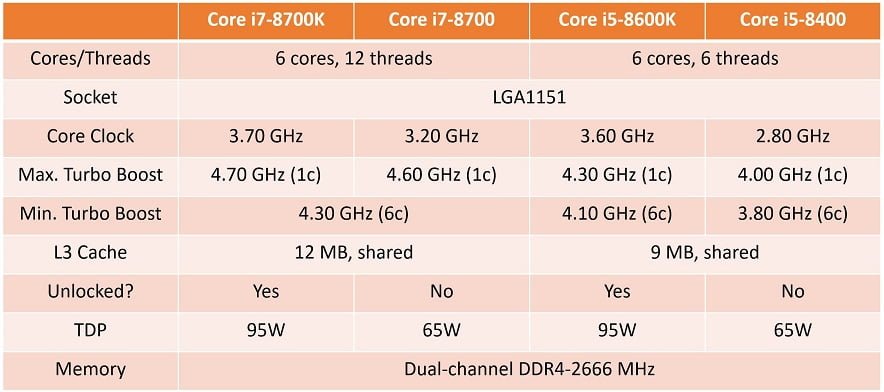 همچنین اطلاعات جدید نشان می دهد که این احتمال وجود دارد که با وجود استفاده ی پردازنده های Coffee Lake از سوکت LGA1151، اما چیپست های سری 100 و 200 اینتل آنها را پشتیبانی نمی کنند؛ با این وجود ظاهرا مادربردهای سری 300 از پردازنده های SkyLake و KabyLake پشتیبانی خواهند کرد.همچنین این شرکت در پردازنده های نسل هشتم از نوعی گرافیک مجتمع موسوم به UHD استفاده کرده است که می تواند کدک VP9 را در وضعیت 10 بیتی در دقت 4K رندر نماید. این محصولات از خروجی های گرافیکی HDMI 2.0 و DP 1.4 نیز پشتیبانی خواهند کرد. جدول زیر موج اول پردازنده های Coffee Lake را نشان خواهد داد.