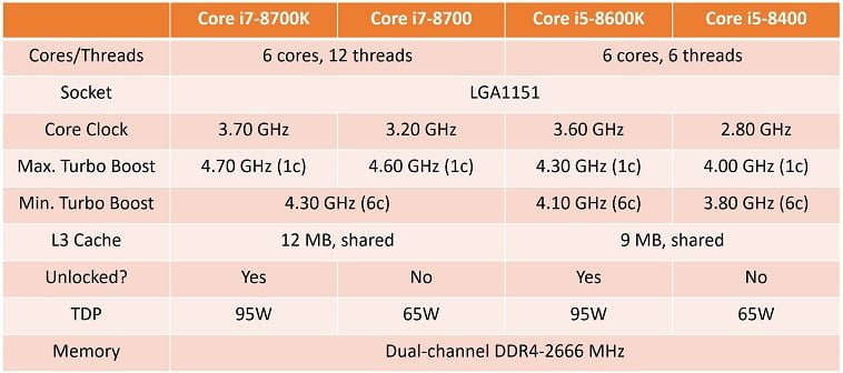 به عنوان مثال پردازنده Core i7-8700K که جایگزین Core i7-7700K خواهد شد، با قیمت 400 دلار راهی بازار می گردد و این در حالی است که Core i7-7700K دارای قیمت 340 دلار است. i5-8600K نیز با قیمت 300 دلار جایگزین پردازنده i5-7600K با قیمت 250 دلار می گردد. همانطور که گفته شد، اولین موج از پردازنده های نسل هشتم (کافی لیک) شامل مدل های پرچمدار (Core i7 و Core i7) خواهند بود که اینبار با افزایش تعداد هسته و رشته های پردازشی، عملکردی بسیار بیش از پیش را نمایان خواهند کرد. به عنوان مثال CPU شش هسته ای Core i7-8700K دارای HyperThreading است که 12 هسته منطقی را به OS معرفی کرده و 12 مگابایت حافظه نهان سطح L3 نیز در آن به خدمت گرفته شده است. این برای اولین بار پس از سالهاست که اینتل تعداد هسته های پردازنده های Mainstream خود را افزایش می دهد.