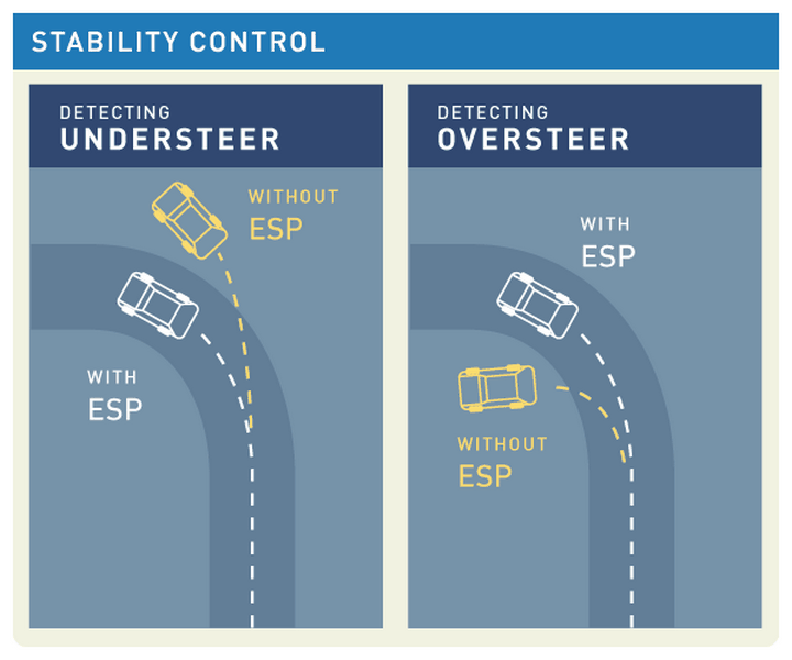 Under Steer: هنگامی که سیستم تشخیص دهد جلوی خودرو درحال منحرف شدن از مسیر باشد، در این مثال سیستم، چرخ های جلو سمت راننده و عقب سمت شاگرد را کنترل میکند و از منحرف شدن خودرو جلو گیری میکند.