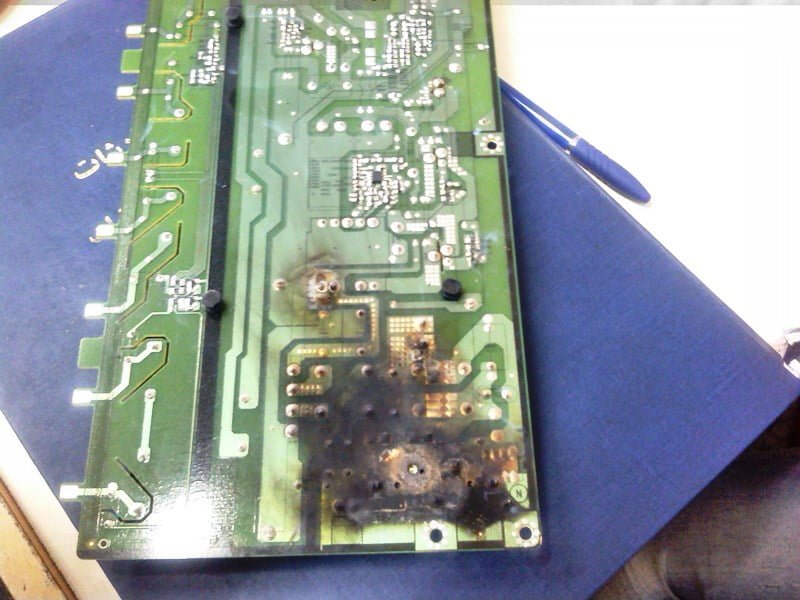 شدت جریان و گرمای ناگهانی در عرض چند ثانیه دما را به حدی رسانده است که قلع های روی برد آب شده و به صورت ترکش به اطراف دستگاه پرتاب شده اند!شدت ولتاژ ورودی چیزی بین 850 تا 1000 بر آمپراژ بالا تخمین زده است.