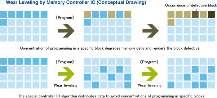 همانطور که می دانید،تمامی IC های NAND دارای عمری مشخص هستند.تعداد چرخه خواندن و نوشتن در آنها به اصطلاح تخصصی سیکل نامیده می شود.اما آیا تا به حال با خود فکر کرده اید که اگر یک یا چند IC که در “خوش آمد” قرار گرفته اند،مدام در حال خواندن/نوشتن باشند،به طور حتم آنها را زودتر از دست خواهیم داد؟ Wear Levelingوظیفه ی مدیریت الگوریتم سلول ها را به منظور ذخیره سازی،در دست دارد.کنترل آن که یک بخش مدام در چرخه قرار نگیرد و باقی سلول های نیز به همان اندازه در سیکل شریک باشند،وظیفه این بخش به شمار می رود.