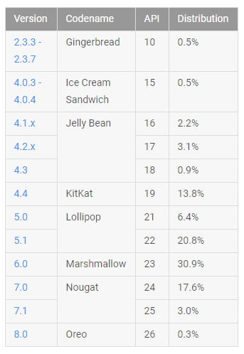 باوجود اینکه آخرین نسخه از اندروید، اوریو در ماه آگوست روانه بازار شد، این سیستم عامل همچنان توسط بیساری از تلفن های هوشمند استفاده نمی شود. در حال حاضر تنها 0.3 درصد از دستگاه هایی که اخیراً از گوگل پلی بازدید کرده اند مجهز به اندروید 8.0 می باشند. این وضعیت بهبود آنچنانی نخواهد یافت تا زمانیکه هواوی و HMD گوشی های جدید خودشان را در پایان سال جاری به اندروید جدید به روز رسانی کنند. پس از آن ممکن است کمی این آمار تغییر کند و گوشی های بیشتری در بازار آخرین نسخه از اندروید را پذیرا باشند.