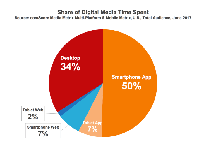 گزارشی که اخیرا توسط موسسه مطالعاتی comScore منتشر شده نشان می دهد 57 درصد زمان سپری شده کاربران با دستگاه های دیجیتالی در اپلیکیشن های موبایلی صورت می گیرد. نکته جالب آنکه 50 درصد از این زمان متعلق به گوشی های موبایل و تنها 7 درصد متعلق به تبلت ها است. پلتفرم دسکتاپ 34 درصد از زمان کاربران را به خود اختصاص می دهد و وب موبایل نیز تنها در 9 درصد از زمان های سپری شده توسط کاربران با آنهاست. همچنین در بخش دیگری از این گزاش نیز آمده است که استفاده از اپ ها در بین کاربرانی با سن کمتر رایج تر از کاربران مسن تر است. ظاهرا کاربرانی با سن بین 18 تا 24 سال تقریبا دو سوم از زمان خود را که معادل تقریبا 3 ساعت در روز است در اپلیکیشن ها می گذرانند؛ این آمار با افزایش سن کاهش می یابد تا جایی که کاربرانی با سن 65 سال و بیشتر تنها 27 از زمان روزانه خود را با اپلیکیشن ها پر می کنند.