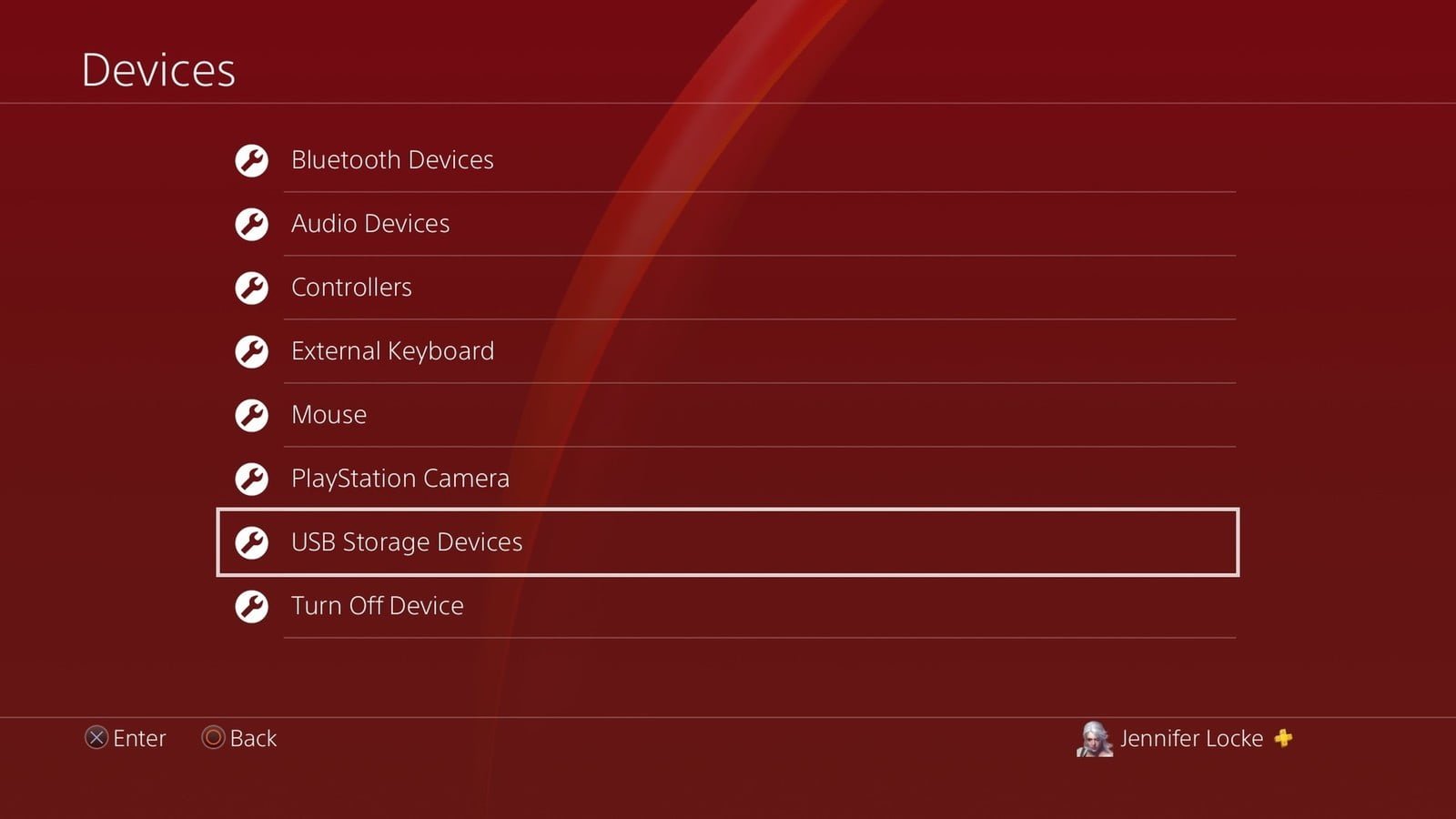 برای این کار توجه داشته باشید که هارد اکسترنال شما می بایست از پورت USB 3.0 (نسخه سوم) استفاده کند و پورت های قدیمی تر قابلیت اجرای بازی ها از هارد بر روی پلی استیشن را ندارند. همچنین به یاد داشته باشید که محتویات هارد شما برای فرمت کردن پاک خواهند شد در نتیجه بهتر است از یک هارد خالی برای این کار استفاده کنید. ابتدا هارد درایو خود را از طریق پورت USB به پلی استیشن متصل کنید. حالا از منوی دستگاه وارد بخش Settings و بعد devices شده و گزینه USB Storage Devices را انتخاب کنید.