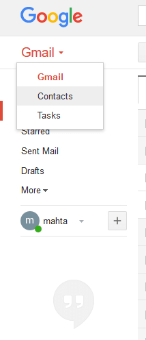 - برای شروع به صفحه ی google.com بروید و یا می توانید از طریق جیمیلتان بر روی منوی کشویی Gmail کلیک کنید و وارد Contacts شوید.