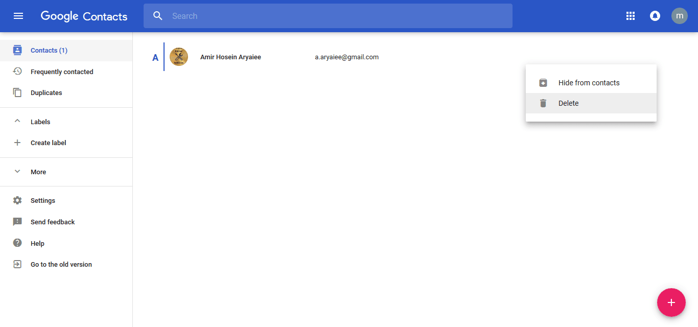 - سپس در کنار نام مخاطب، بر روی گزینه سه نقطه کلیک نمایید و گزینه ی Delete را انتخاب کنید.