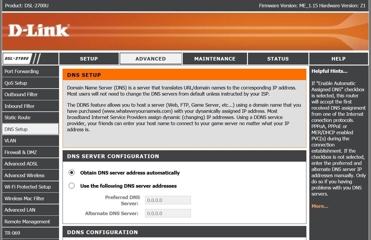 صفحه تنظیمات برای هر برند مودم متفاوت است و حتی بسته به نسخه فیرمور ممکن است مودم های یک برند هم دارای صفحه تنظیمات متفاوتی باشند. با این حال معمولا در بخش advanced می توانید گزینه ای با عنوان DNS Setup را پیدا کنید (در مودم های D-Link از این مسیر قابل دسترسی است و برای مثال در مودم های TP-Link از مسیر Interface Setup و سپس DHCP و در مودم های Linksys از مسیر Basic Setup می توانید بخش تنظیم DNS را مشاهده کنید). پس از رسیدن به این صفحه تنظیمات مشاهده می کنید که DNS به شکل خودکار یا اتوماتیک برای مودم تنظیم می شود اما شما باید آن را به صورت دستی وارد کنید. برای این کار می توانید از DNS های زیر استفاده کنید: