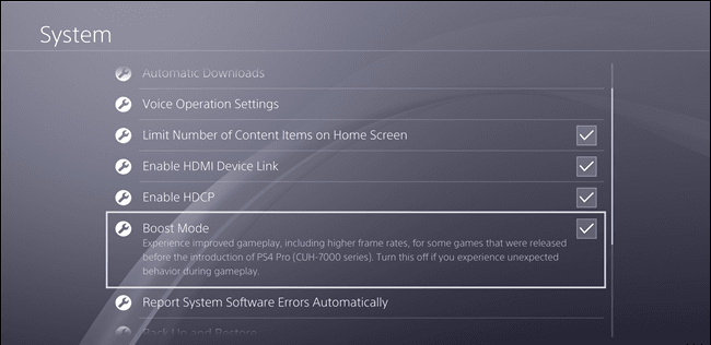 Boost Mode در نسخه پرو از پلی استیشن 4 در اختیار کاربران قرار داده شده و به صورت خلاصه باید گفت Boost Mode به بازی های قدیمی تر که به شکلی اختصاصی برای اجرا بر روی نسخه پرو بهینه سازی نشده اند اجازه می دهد از تمام ظرفیت های کنسول برای اجرای هر چه بهتر، سریعتر و روانتر استفاده کنند. همان طور که می دانید پردازنده به کار رفته در نسخه پرو تفاوتی با نسخه های دیگر ندارد اما پردازشگر گرافیکی و حافظه رم آن به مراتب قدرتمندتر هستند. بسیاری از بازی ها برای اجرا بر روی نسخه پرو بهینه سازی نشده اند زیرا اصولا قبل از معرفی این نسخه وارد بازار شده اند. اما با استفاده از Boost Mode در بازی هایی که در حالت عادی امکان اجرای آنها با نرخ 30 فریم در ثانیه وجود ندارد می توان به راحتی خروجی 60fps دریافت کرد.