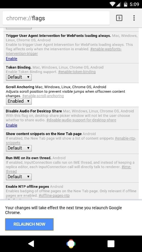 در این مرحله منوی کشویی Scroll Anchoring را باز کرده سپس enable را انتخاب کنید. حال در پایین صفحه بر روی Relaunch Now کلیک کرده تا مرورگر بسته شده و مجددا اجرا شود.
