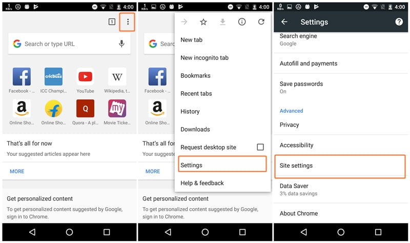 برای دسترسی به این قابلیت وارد مرورگر کروم در گوشی یا تبلت اندرویدی خود شوید و بر روی گزینه ی (…) یا منو کلیک کنید. در نهایت باید وارد Settings شوید و در صفحه ی تنظیمات وارد Site Settings شوید.