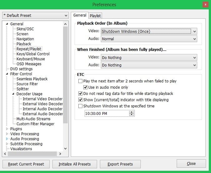 ابتدا فیلم را در نرم افزار اجرا نموده و با زدن دکمه F2 به Navigate to general رفته سپس Repeat /playlist را انتخاب کنید.playback order برای خاموش شدن کامپیوتر بعد از اتمام فایل در حال اجرا و گزینه when finished برای خاموش شدن پس از اتمام لیست پخش می باشد. برای این کار لیست کشویی را باز کرده و گزینه Shut down را انتخاب کنید. کار تمام شد و حالا پس از اتمام فیلم کامپیوتر به صورت خودکار خاموش میشود. البته این تنظیمات فقط برای یک بار می باشد و برای خاموش شدن خودکار در دفعات بعدی باید دوباره این تنظیمات را انجام دهید.