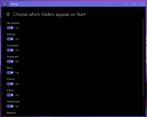 در پنل سمت چپ در استارت منو ،حداقل دو ایکون (تنظیمات اکانت و power option) و حداکثر 12 ایکون قابل دسترسی هستند. برای شخصی سازی این پنل میتوان به منوی setting و سپس مسیر Personalization > Start > Choose which folders appear on Start رفت. در این بخش میتوان با زدن دکمه هر یک از آیتم های File Explorer, Settings, Documents, Downloads, Music Pictures Videos, HomeGroup, Network and Personal folder. آن ها را فعال یا غیر فعال کرد.