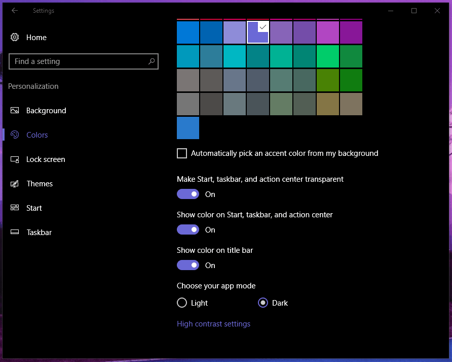 برای تغییر رنگ منوی استارت ، taskbar یا Start screen باید منوی تنظیمات را باز کرده(Settings menu) و به مسیر Personalization > Colors > Show color on Start, taskbar, and action center رفته و این گزینه را فعال و رنگ مورد علاقه خود را انتخاب کنید.