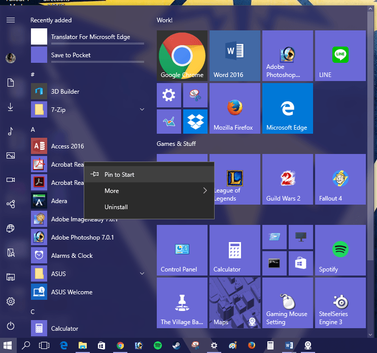 با اضافه کردن ایکون نرم افزار ها به منوی استارت دسترسی به آن ها سریع تر و راحت تر می شود. برای این کار ابتدا نرم افزار مورد نظر را از قسمت چپ منوی استارت انتخاب کرده و با کلیک راست کردن بر روی آن و انتخاب pin to start نرم افزار در منوی استارت به شکلی شبیه کاشی قرار میگیرد.