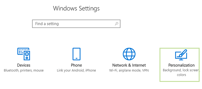 ابتدا از منوی Start وارد بخش Settings یا تنظیمات شوید. سپس در پنجره ی تنظیمات وارد Choose Personalization شده و در بخش سمت راست گزینه ی Themes را انتخاب نمایید.
