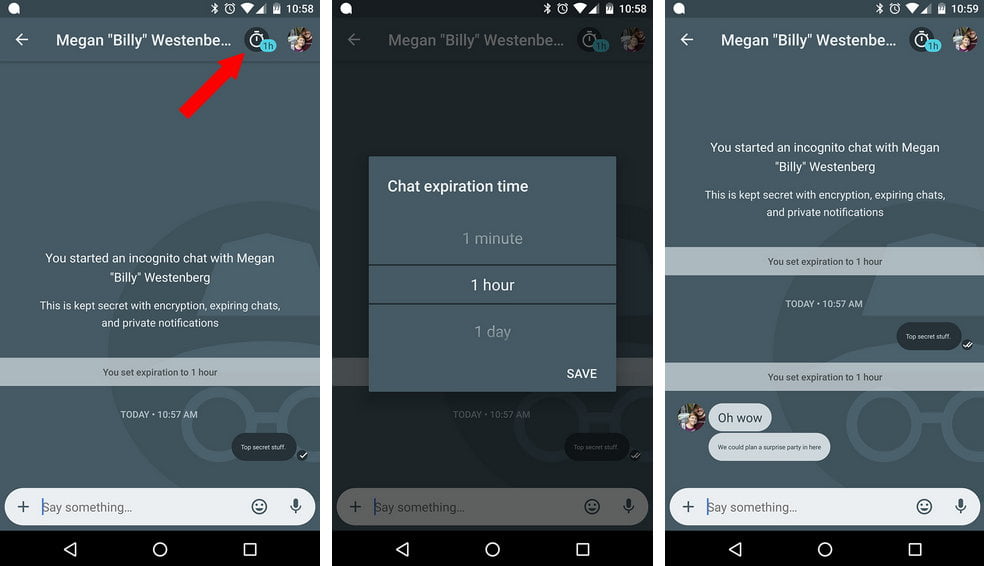 آموزش عملا به پایان رسیده است اما نکاتی برای کاربران مبتدی وجود دارد که پیش از گفت و گو در این حالت باید از آن مطلع باشید. در حالت گفت و گوی مخفی یا همان incognito Chat شما اعلانیه ای با جزئیات پیام دریافت نمیکنید. در واقع اگر مخاطبی که در حالت گفت و گو با او در حالت مخفی هستید پیامی برای شما ارسال کند شما اعلانیه ی You Have a new message را دریافت میکنید. مطمئنا این یک قابلیت واجب برای یک گفت و گوی مخفی است. در ابتدای مطلب از ویژگی ” امکان گفت و گو با تاریخ انقضا” صحبت کردیم. ممکن است دقیقا این موضوع را درک نکرده باشید. در این مورد باید گفت که شما میتوایند زمانی برای انقضای پیام های ارسال شده تنظیم کنید تا یک پیام پس از مدت زمان 5 ثانیه، 10 ثانیه، 30 ثانیه، 1 دقیقه، 1 ساعت، 1 روز یا یک هفته به طور خودکار از داخل برنامه پاک شود و یا میتوانید کلا این قابلیت را غیر فعال کنید. نحوه ی زمان بندی انقضای یک گفت و گو در حالت مخفی Allo بدین شکل است: