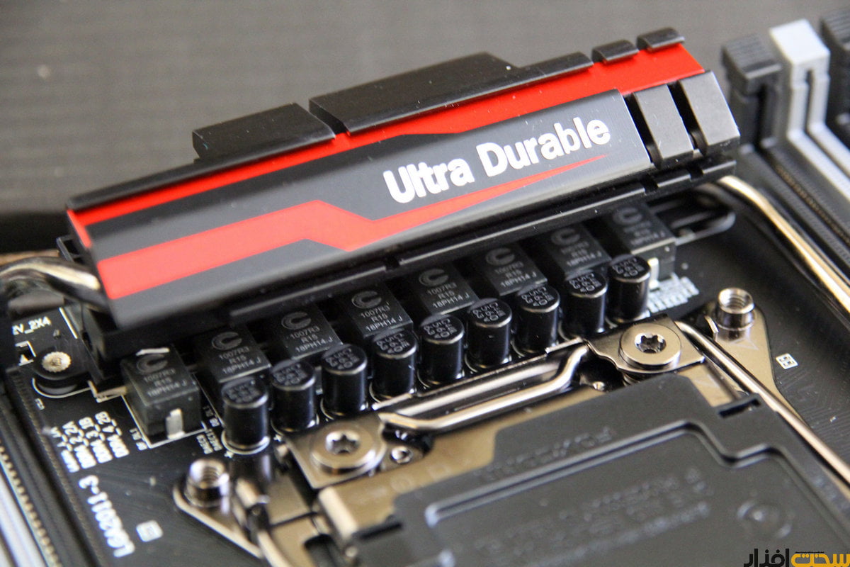 هیت سینک بزرگ چیپ ست X99 که با LED روشن می شود. دو لوله انتقال حرارت گرما را به هیت سینک کمکی و هیت سینک مدار رگولاتور منتقل می کنند.