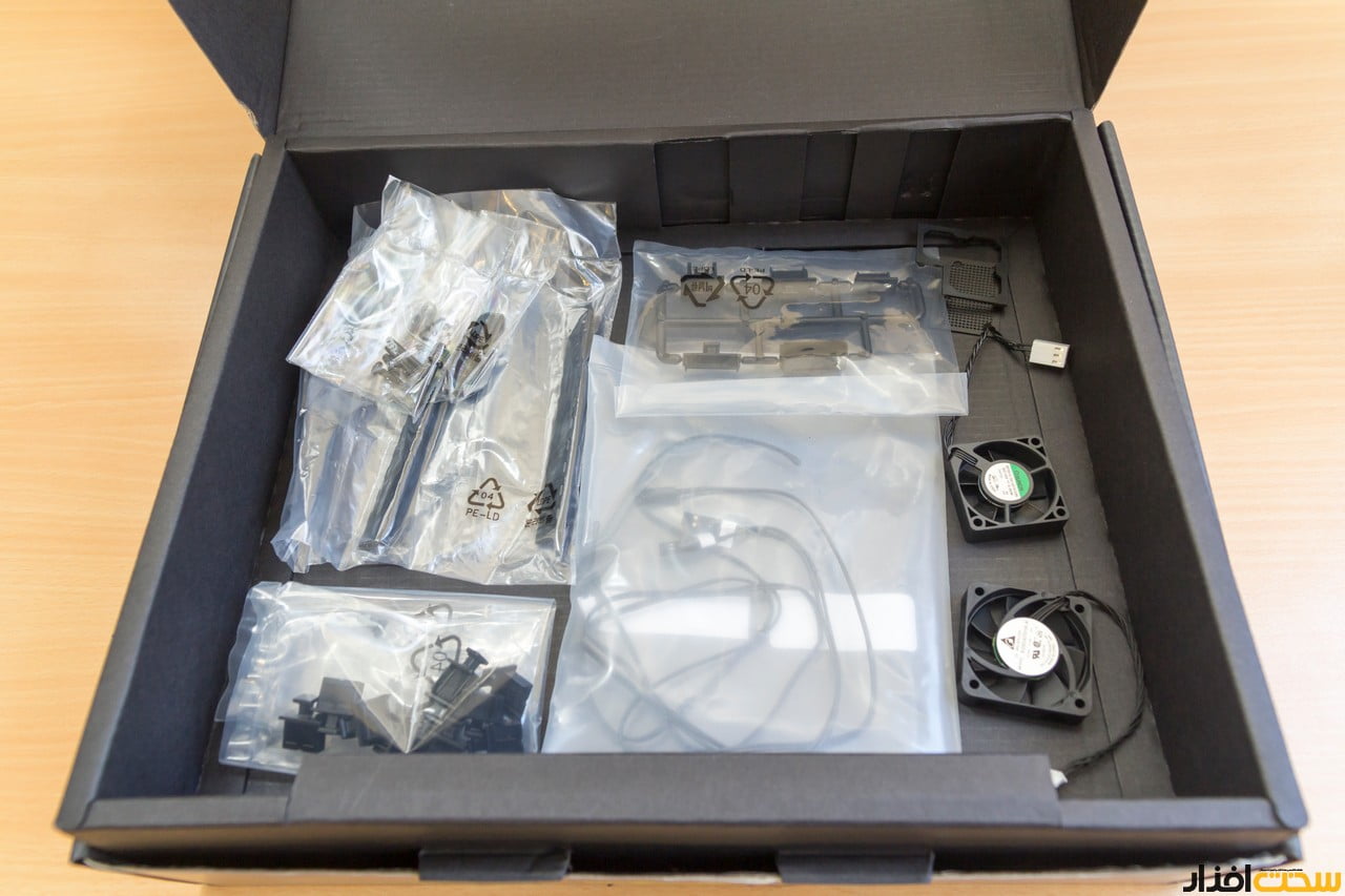 علاوه بر لوازم جانبی استاندارد، دو فن کوچک، سنسور های دما و محافظ هایی برای پورت ها و رابط های مادربورد در نظر گرفته شده اند تا مانع از ورود گرد و غبار شوند.