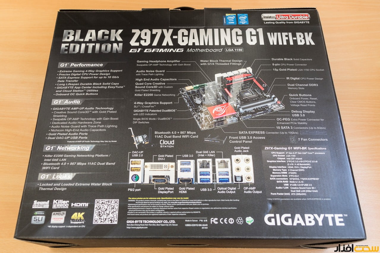 و اینک مادربورد GIGABYTE Z97X-GAMING WIFI-BK سر از جعبه بر می آورد! همانطور که مشاهده می شود چهار رابط PCI-E برای نصب کارت گرافیک وجود دارد و می توان خنک کننده های واترکول را روی هیت سینک های مدار رگولاتور نصب کرد.