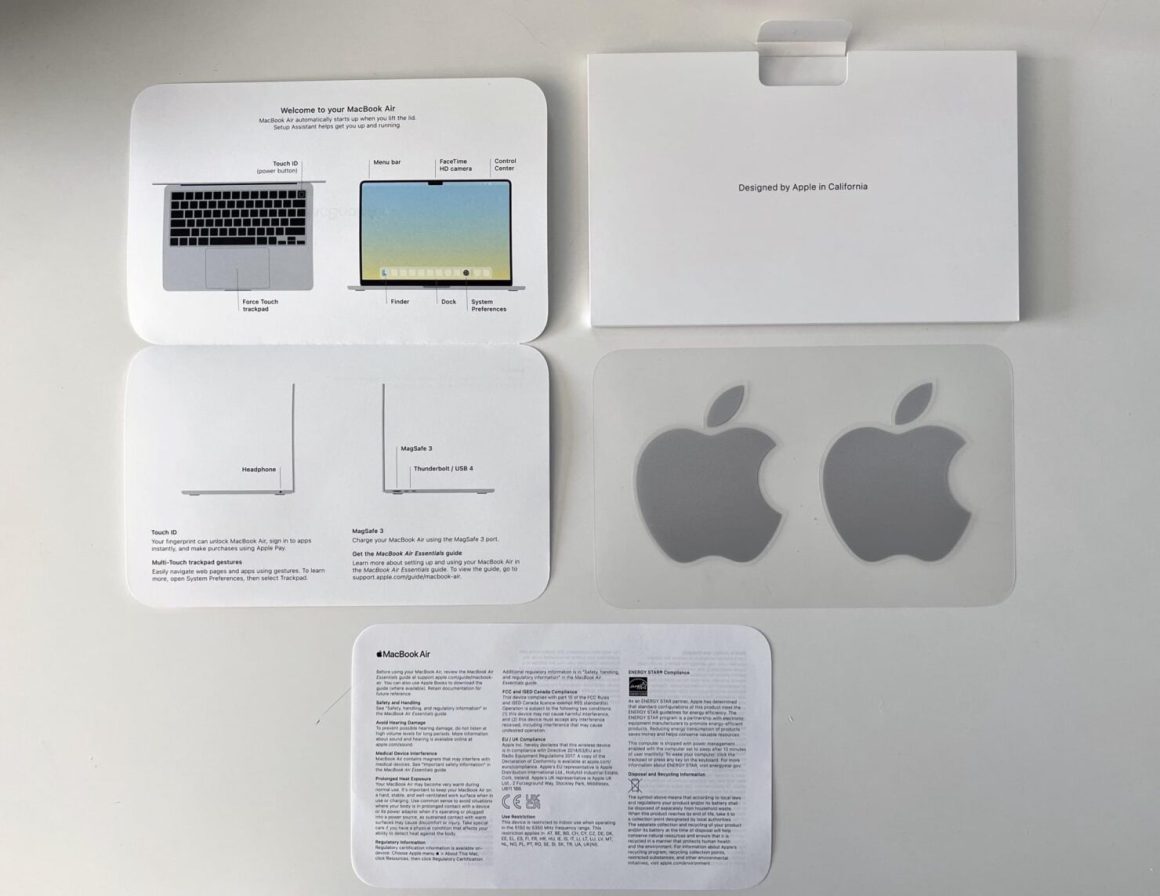 در داخل بسته بندی مک بوک ایر M2 یک کابل شارژ MagSafe 3 وجود دارد که رنگ آن با رنگ دستگاه یکسان است. علاوه بر کابل شارژ و خود دستگاه، شرکت اپل یک دفترچه راهنما، یک راهنمای راه اندازی سریع و تعدادی استیکر هم داخل بسته بندی قرار میدهد.