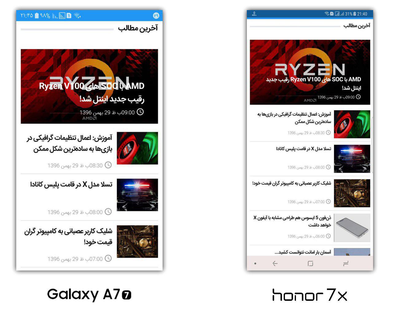 همانطور که در تصویر قابل مشاهده است، نمای جلوی این دو گوشی با اینکه ابعاد بدنه تقریباً یکسانی دارند، بسیار متفاوت می باشد. این امر بدلیل استفاده آنر از نمایشگر تمام صفحه با حذف حاشیه ها اتفاق افتاده است. بطوریکه باعث شده است در این بدنه نمایشگری به اندازه 5.93 اینچ جای بگیرد. البته سامسونگ نمایشگر چندان کوچکتری ندارد و بزرگی آن 5.7 اینچ می باشد. بزرگی نمایشگر آنر باعث شده تا رزولوشن (1080×2160) و تراکم پیکسلی (407 ppi) آن نسبت A7 با رزولوشن 1080×1920 و تراکم پیکسلی 386 ppi بیشتر باشد. یکی از مزیت های نمایشگر 18:9 و کم حاشیه آنر 7x اینست که می تواند محتوای بیشتری را در شرایط مشابه با A7 به نمایش بگذارد.