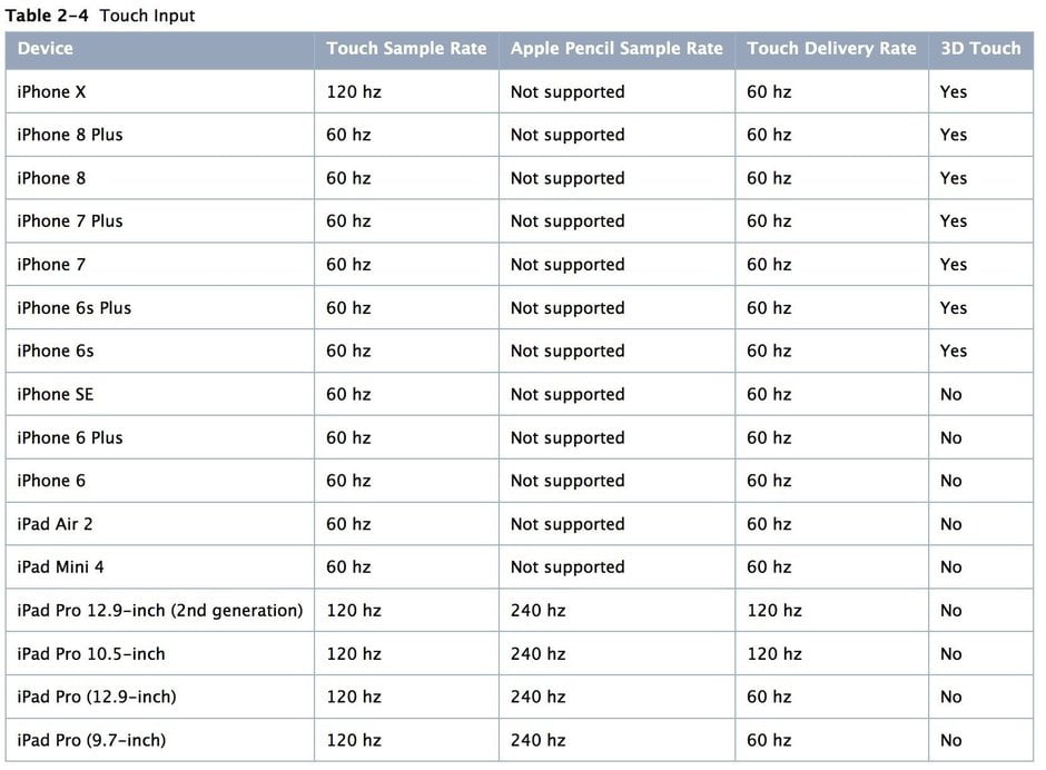 در جدول زیر می توانید مشاهده کنید که  iPhone X در واقع نرخ ردیابی 120 هرتز و نرخ به روزرسانی 60 هرتز دارد و این دقیقاً همان چیزی است که در آیفون های جدید اپل هم مشاهده می شود و نه بیشتر. اما اینکه چرا اپل قصد داشت در مراسم رونمایی با بزرگنمایی یک قابلیت که در نسل قبلی گوشی ها هم به همان صورت ارائه شده بود، کاربران را گمراه کرده و به هیجان آورد، سوالیست که تنها خود آنها می توانند به آن پاسخ دهند.