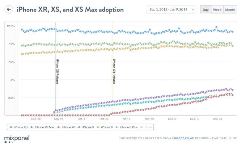 آیفون XS Max به لطف داشتن باتری با ظرفیت بیشتر، نمایشگر بزرگتر و نسبت قیمت به سخت افزار مناسب تر تا به حال بیشتر از مدل XS فروش داشته اما رقیب جدی آن نه دستگاهی از کمپانی های دیگر، بلکه محصولی ارزان قیمت تر از کارخانه خود اپل است. در گزارشی که اخیرا از سوی Mixapanel منتشر شده به خوبی مشخص است که XR همین حالا هم XS را پشت سر گذاشته و اگر به روند صعودی خود ادامه دهد ظرف چند ماه آینده حتی مدل قدرتمندتر XS Max را هم کنار می گذارد.