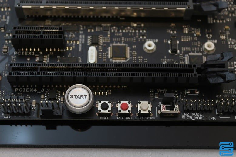در انتهای مادربرد و در کنار اسلات های توسعه، پنل اصلی کلید های فیزیکی اورکلاک قرار دارد. از جمله مهمترین این کلید ها می توان به سوئیچ های LN2 اشاره کرد.