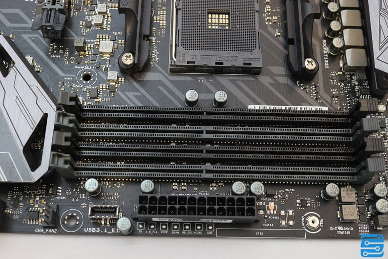 4 اسلات حافظه رم DDR4 بر روی برد تعبیه گشته؛ این مادربرد از 64 گیگابایت حافظه اختصاصی از نوع DDR4 و با فرکانس حداکثر 3200 مگاهرتز پشتیبانی می کند. جهت اطلاع از رم های سازگار با این محصول، می توانید به جدول QVL (Qualified Vendors Lists) مراجعه نمائید. در کنار اسلات های رم، یک هدر خارجی USB 3.1 نیز تعبیه شده است که می توان در آینده از آن جهت اتصال به پنل کیس های جدید بهره گرفت.