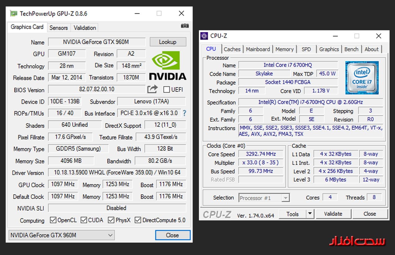 لنوو برای فرزند خود از پردازنده Core i7 6700HQ استفاده کرده است. این پردازنده با 4 هسته پردازشی و 8 رشته موازی می تواند فرکانسی برابر با 2.6 گیگاهرتز تا 3.5 گیگاهرتز را داشته باشد. از دیگر ویژگی های این پردازنده می توان به معماری ساخت 14 نانومتری، 6 مگابایت کش، حداکثر مصرف انرژی 45 وات، پشتیبانی از رمهای DDR4 و پردازنده گرافیکی Intel HD Graphics 530 با فرکانس 350 تا 1050 مگاهرتز اشاره کرد. این پردازنده نسبت به نسل قبل خود در بخش تک رشته ای تغییر چندانی در عملیات پردازشی نداشته است اما تفاوت آن زمانی آشکار می شود که تمام رشته ها و هسته های پردازنده برای عملیات پردازشی درگیر شوند. پردازنده گرافیکی استفاده شده GeForce GTX 960M انویدیا است. این پردازنده گرافیکی که از خانواده مکسول است، دارای معماری ساخت 28 نانومتری است. ویژگی های این پردازنده گرافیکی شامل رابط حافظه 128 بیتی، فرکانس کاری 1029 تا 1097 مگاهرتز، 4 گیگابایت حافظه از نوع GDDR5 با فرکانس 5000 مگاهرتز، وجود 1870 میلیون ترانزیستور و پشتیبانی از DirectX 12 است. 16 گیگابایت رم از نوع DDR4 با فرکانس کاری 2133 مگاهرتز با قابلیت افزایش تا 32 گیگابایت از دیگر ویژگی های این محصول است. لنوو برای منبع ذخیره سازی از 1 ترابایت هارد با سرعت 5400 دور در دقیقه و یک SSD با ظرفیت 128 گیگابایت بهره برده است. از دیگر موارد قابل ذکر می توان به شبکه بیسیم دو بانده با استاندارد 802.11ac، بلوتوث نسخه 4.0 و وب کم HD اشاره کرد (تصویر 11).