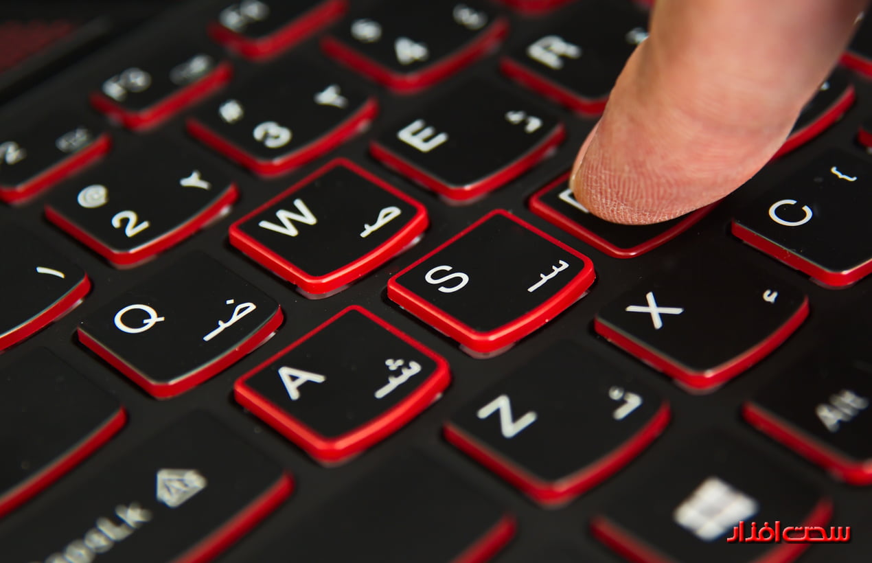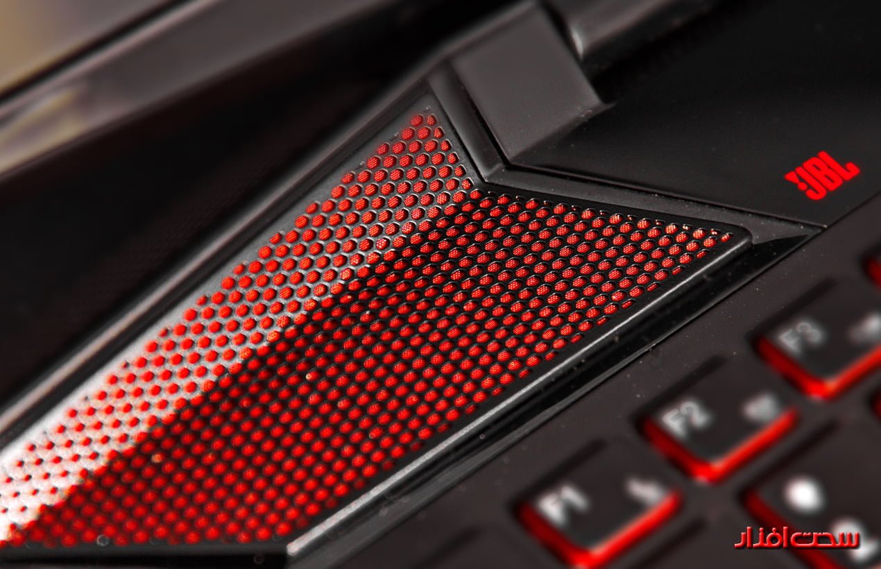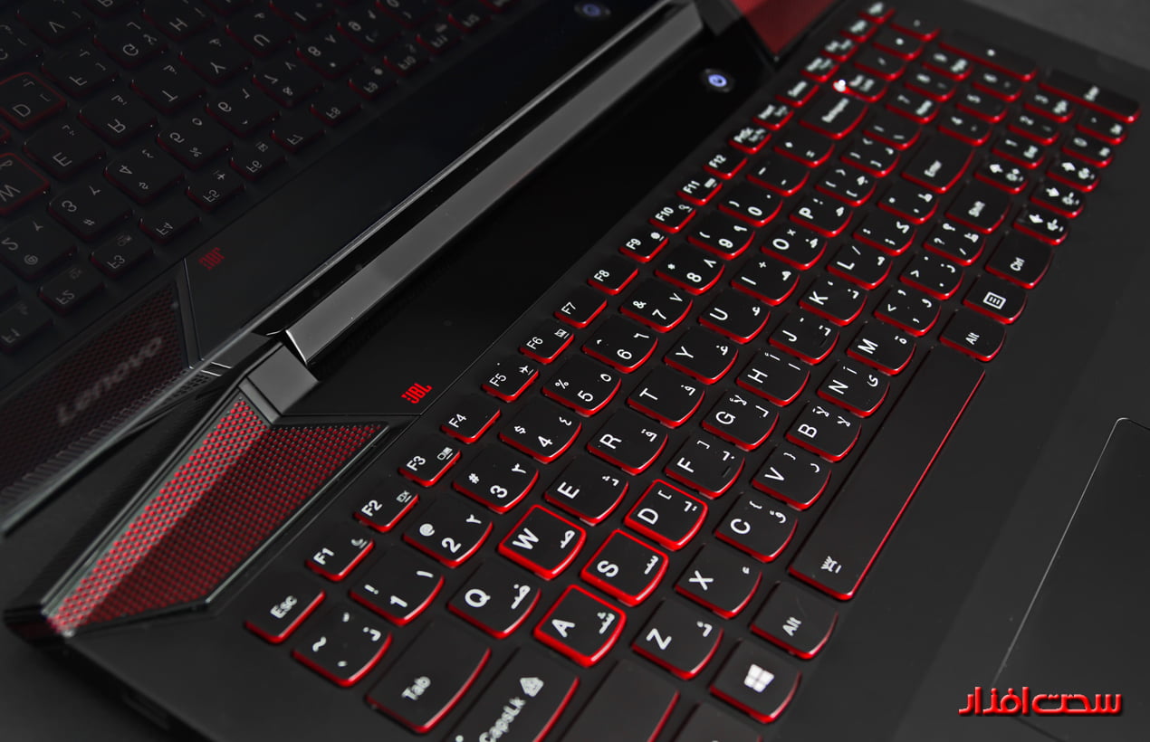 در دو سمت لولا، دو اسپیکر با پوشش شبکه ای قرمز رنگ کاملا جلب توجه می کنند. این دو بخش که در امتداد شبکه های قرمز رنگ بیرونی شکل گرفته اند، به هماهنگی بین طراحی بیرونی و داخلی کمک بسیار کرده است. نشان JBL یکی دیگر از مواردی است که به سرعت به چشم می آید که حکایت از صدای بهینه این بازیکن دارد. جنس به کار رفته در پوشش پنل داخلی لپ تاب اثر انگشت و لک را به خوبی به خود جذب می کند که این روزها در بسیاری از لپ تاب ها شاهد آن هستیم. با کمک خطوط شکل گرفته، صفحه کلید کمی به سمت داخل فرو رفته است تا کاربر برای تایپ کردن یا بازی کردن راحتی بیشتری را با این بخش از لپ تاب داشته باشد. لنوو حاشیه تمام کلید ها را در این صفحه کلید، قرمز در نظر گرفته است تا در کنار هماهنگی با دیگر بخش های لپ تاب، نور پس زمینه را با جذابیت بیشتری بخش کند. این حاشیه های قرمز رنگ در تمام کلید ها برابر است اما وجود کلید های A، W، S و D با حاشیه های پرتر و رنگی تر، گیمینگ بودن این محصول را بیش تر از پیش یاد آوری می کند (تصویر 5).