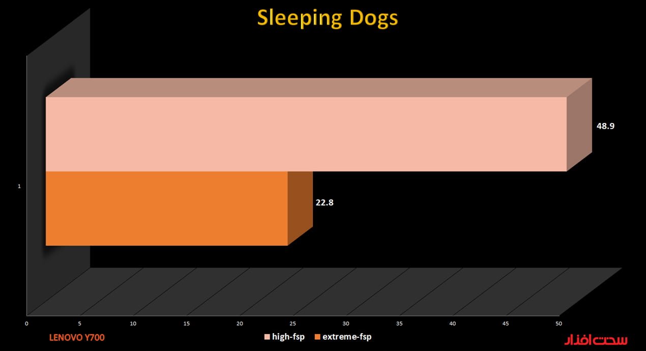 Sleeping Dogs : این بازی در بخش بنچمارک خود از محیط شلوغ شهری استفاده می کند که می تواند به خوبی قطعات را به چالش بکشد. گزینه های انتخابی برای انجام تست ها در این بازی بروی EXTREME و HIGH قرار می گیرد و رزولوشن هم بروی 1080×1920 پیکسل قرار داده می شود. پس از اعلام نتیجه شاهد حداکثر فریم در ثانیه، حداقل فریم در ثانیه و متوسط فریم هستیم که برای نتیجه گیری درست قطعات از متوسط فریم استفاده می کنیم.