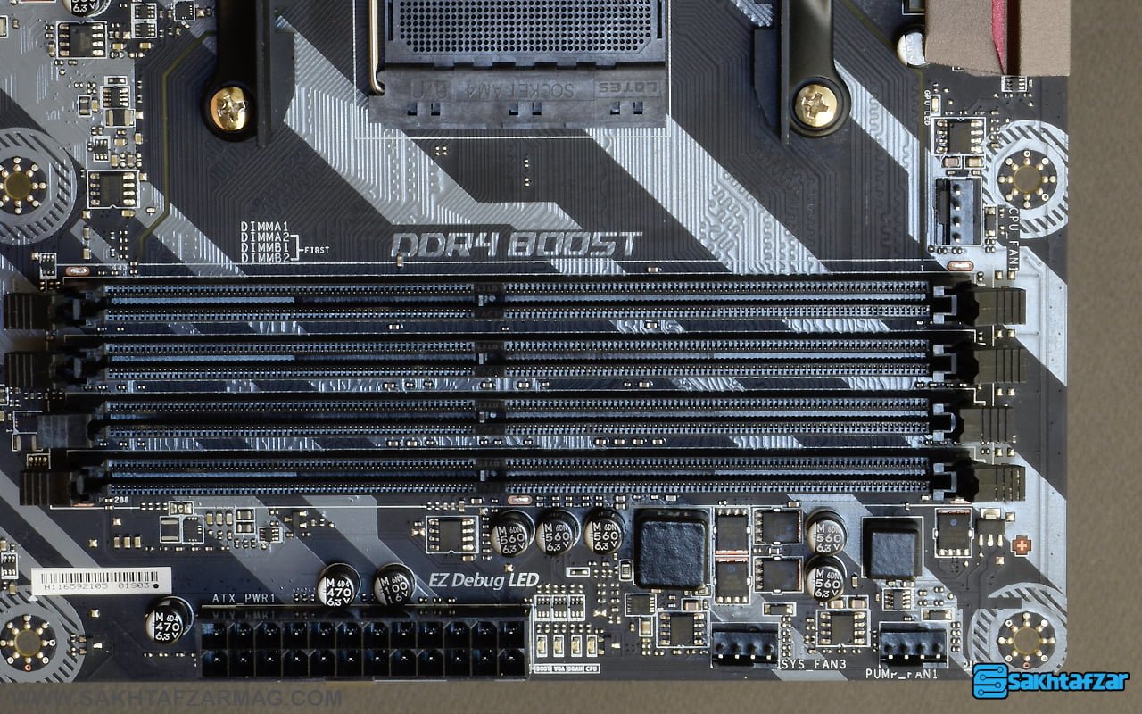 در این مادربرد برای اسلات های DIMM، تعداد 4 اسلات قرار گرفته است که با رنگ مشکی خودنمایی می کنند. در این محصول کاربر می تواند تا حداکثر 64 گیگابایت رم را از نوع DDR4 در اختیار داشته باشد. اسلات ها می توانند به طور استاندار رم ها را با فرکانس 1866، 2133 و 2400 مگاهرتز پشتیبانی کنند اما اگر می خواهید به فرکانس های بالاتر دست پیدا کنید می توانید با فعال کردن A-XMP، فرکانس هایی مانند 2667، 2933، 3200 مگاهرتز و بالاتر را داشته باشید.