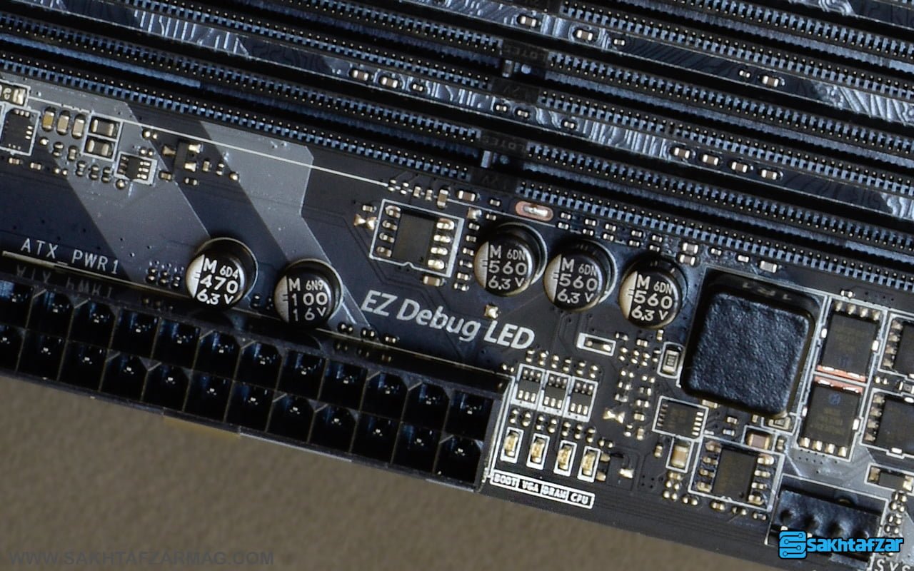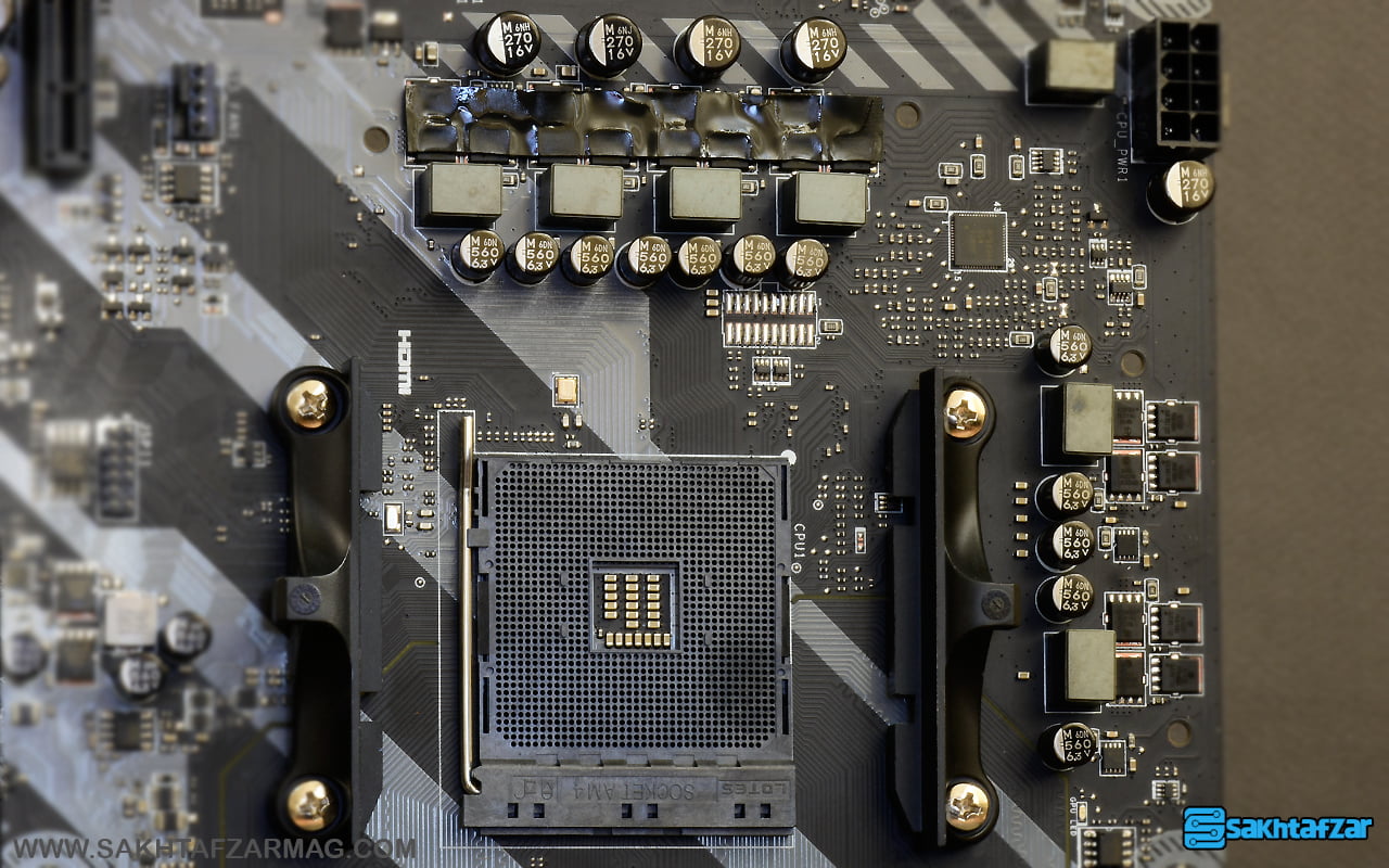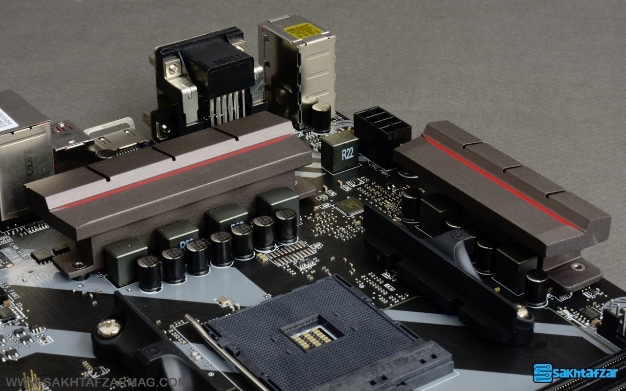 با برداشتن سینک های حرارتی می توان VRM یا مدار فاز قدرت قرار گرفته و چیپ ست مادربرد را مشاهده کرد. این چیپ ست مدیریت پورت های ورودی خروجی همچون USB 2.0، USB 3.1 Gen 1 و ساتا را در دستور کار خود قرار داده است.