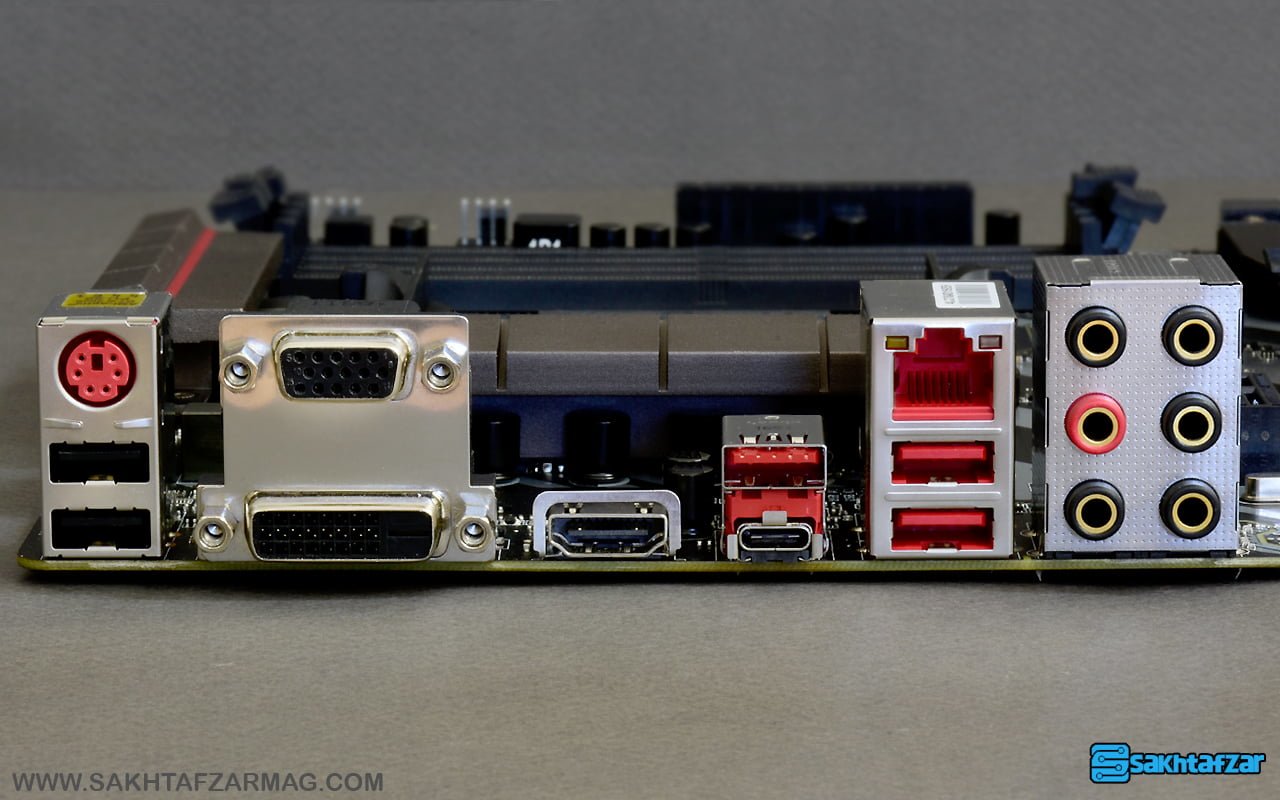 آنسوی مادربرد و در پنل I/O مادربرد، پورت PS/2 برای اتصال ماوس و کیبورد های قدیمی، تعداد 2 پورت USB 2.0 برای اتصال لوازم جانبی، پورت DVI-D با حداکثر رزولوشن 1200 در 1920 پیکسل، پورت VGA با حداکثر رزولوشن 1280×2048 پیکسل، پورت HDMI با حداکثر رزولوشن 2160 در 4096 پیکسل و 24 هرتز، تعداد 3 پورت USB 3.1 Gen1 از نوع Type-A، یک پورت USB 3.1 Gen1 از نوع Type-C، یک پورت LAN RJ45، تعداد 6 جک 3.5 میلی متری با روکش طلایی را در دسترس داریم. هرچند که جای خروجی صدای دیجیتال یا S/PDIF در این بین خالی است.