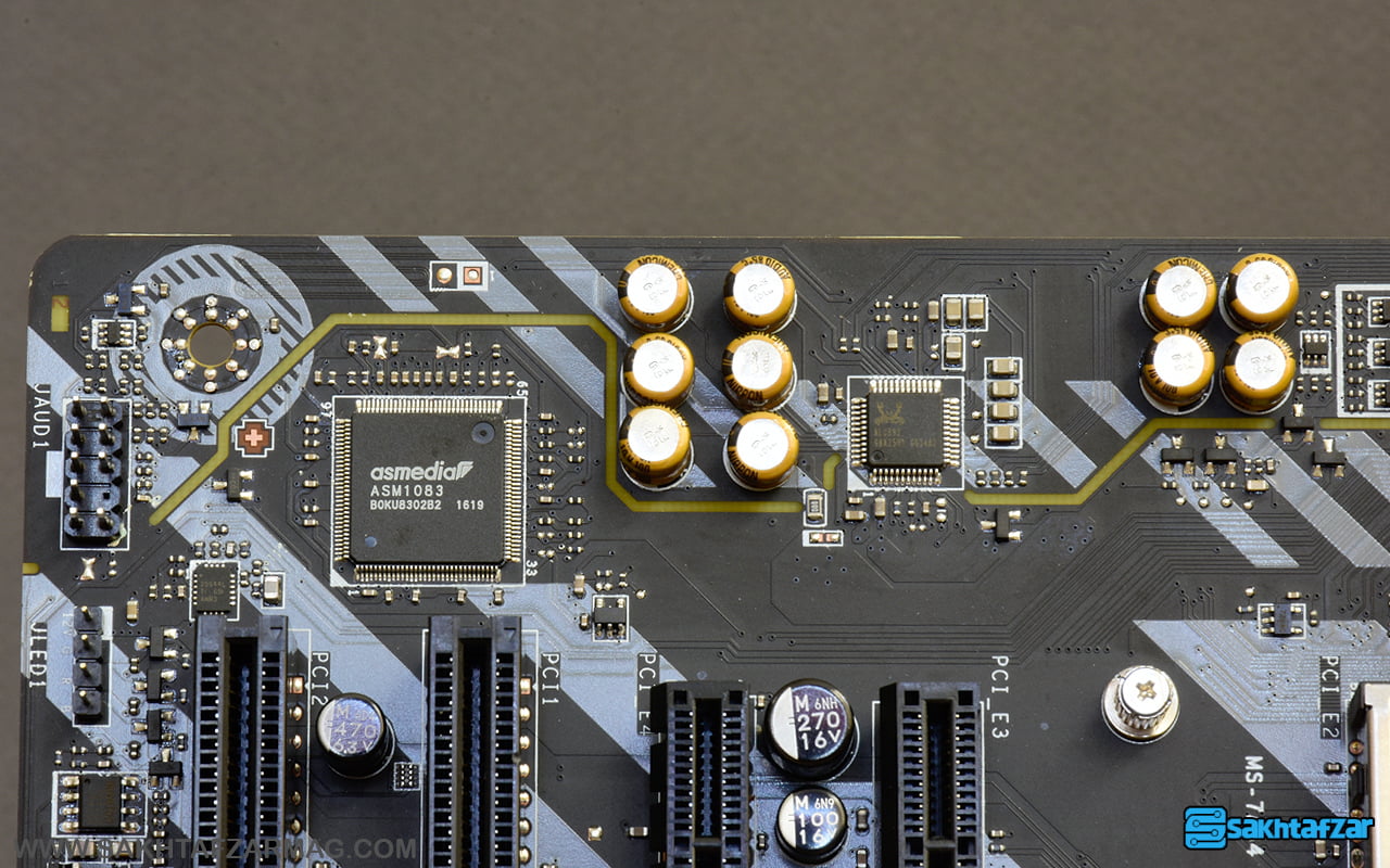 در بخش اسلات های PCIe شاهد 1 اسلات PCI Express X16 هستیم که به پوشش فلزی یا Steel Armor مجهز شده است. این اسلات برای دوام بیشتر و تحمل فشار وارد شده از کارت های سنگین، به زره فولادی مجهز شده است که به افزایش طول عمر و جلوگیری از تخلیه الکترواستاتیک منجر می شود. البته این اسلات در صورت استفاده از پردازنده های رایزن، سرعت X16 را پشتیبانی می کند و اگر از پردازنده های A-series/ Athlon استفاده کنید با سرعتی برابر با X8 روبرو می شوید. در میان اسلات های یاد شده 2 اسلات از نوع PCIe 2.0 x1 هستند و 2 اسلات دیگر از نوع PCI slots هستند که برای استفاده از قطعات جانبی مورد استفاده قرار می گیرد.