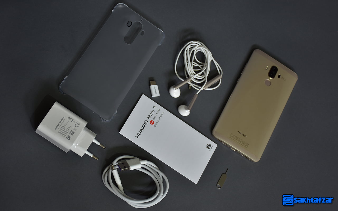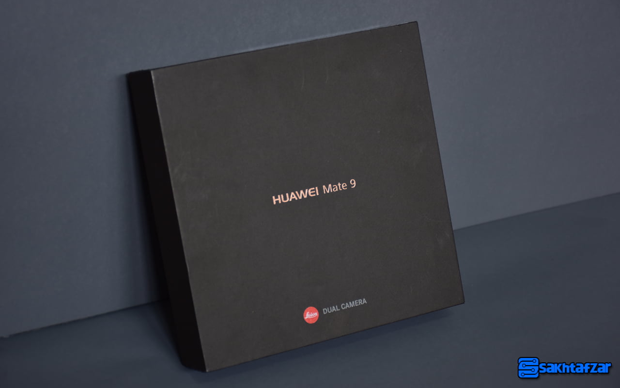 جعبه ای مربعی شکل، رنگ زمینه مشکی و نوشته طلایی رنگ در مرکز جعبه از ویژگی های طراحی جعبه این محصول است. هواوی سعی کرده است جعبه ای ساده اما شیک را برای این محصول در نظر گیرد. نوشته هوآوی میت 9 در مرکز جعبه به رنگ طلایی در آمده است و در زیر آن نوشته دوربین دوگانه با نشان لایکا به جذابیت این جعبه افزوده است.