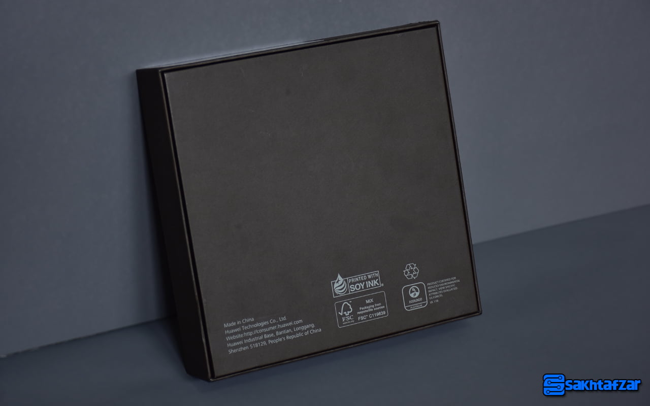 اما پشت جعبه بسیار ساده تر از نمای روبروی آن است. همچنان رنگ مشکی در تمام جعبه دیده می شود و نوشته هایی با رنگ سفید که نشان از ملیت محصول و نشان های محیط زیستی در این بخش دیده می شود. در اطراف جعبه  در سمت راست و چپ نوشته های هواوی دیزاین قرار گرفته است و در نقاط دیگر نشانه هواوی و شناسه محصول را به صورت برچسبی بر روی جعبه در نظر جای خوش کرده است.