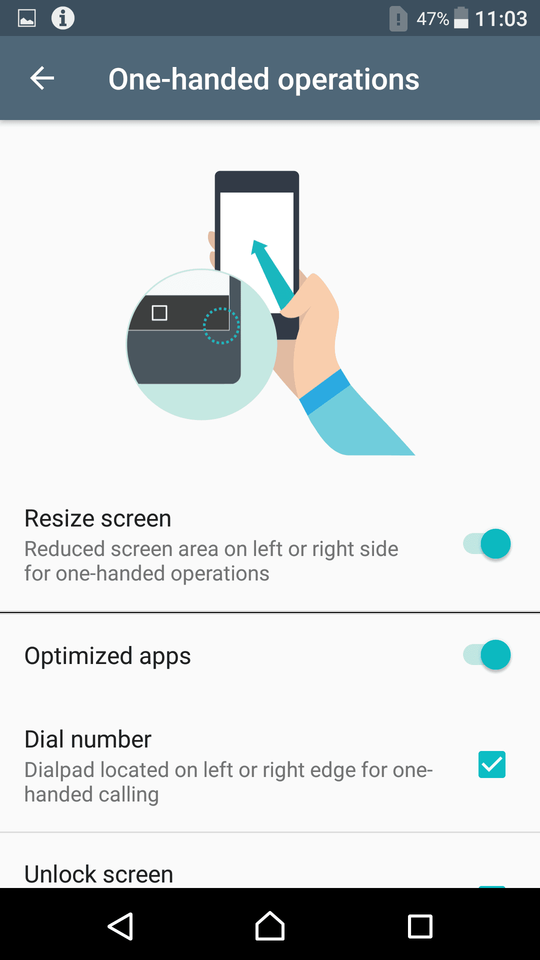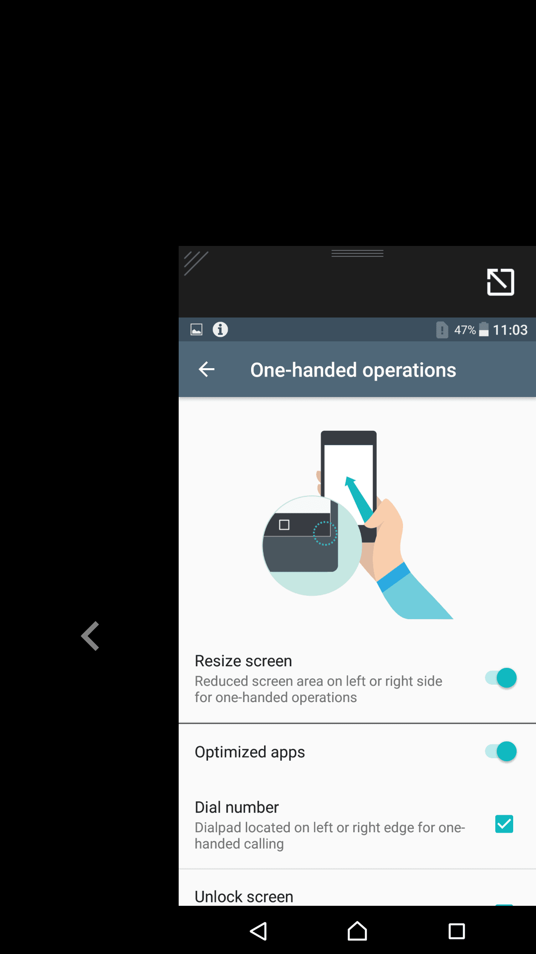 به علت صفحه نمایش بزرگ قابلیت کار کردن با یک دست در تنظیمات این محصول وجود دارد که با فعال کردن آن کار کردن با گوشی راحت تر می شود .