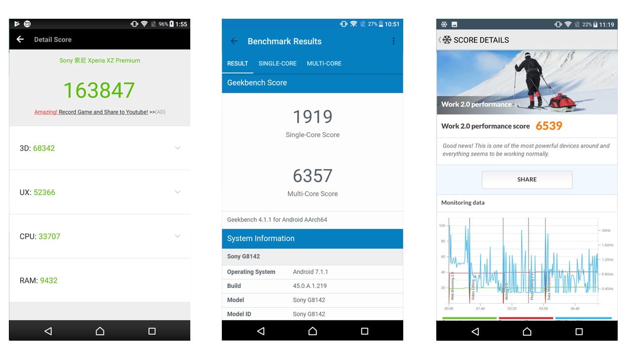 عملکرد سخت افزاری اکسپریا ایکس زد پریمیوم را تنها باید با آیفون 7 و رقیبانی همچون اس 8 سامسونگ و اچ تی سی یو 11 مقایسه کرد. بعد از خرید این محصول به هیچ عنوان کلمه ضعیف را برای پردازش فرامین به کار نبرید و نگرانی از افت فریم را هم به ذهنتان راه ندهید. در کل با این پردازنده می توان ویندوز 10 را به خوبی بالا آورد چه برسد به اندروید 7. با وجود این که اکسپریا ایکس زد پریمیوم در تمام تست ها سربلند بیرون می آید اما نسبت به اس 8 و اچ تی سی یو 11 از امتیازات کمتری برخوردار است. امتیازی که در نرم افزار ترکیبی AnTuTu با این گوشی به دست آوردیم برابر با 163847 امتیاز بود که البته در این نرم افزار به صورت پیش فرض امتیاز این گوشی برابر با 168505ثبت شده است اما اس 8 را اولین بار با امتیاز 172492 بالا آوردیم و در مرحله دوم بعد از بهینه کردن سیستم عامل و از مدار خارج کردن بسیاری از نرم افزارها به امتیاز 177425 دست پیدا کردیم. و اما این نکته را هم بهتر است بگوییم که در پردازش های سه بعدی مواردی به دست آمده است که اکسپریا ایکس زد پریمیوم از دو رقیب قدرتمند خود با اختلاف کمی بالاتر بوده است.
