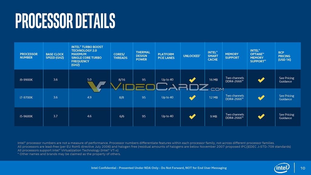 در ادامه، اسلاید های فوق تائید می کنند که پردازنده Core i7-9700K نخستین Core i7 است که بدون قابلیت  HyperThreading معرفی می گردد. هر چند که شاید وجود رشته ها اضافی در برخی برنامه ها کارساز به نظر برسد، اما به یاد داشته باشید که عمدتا سرعت تک هسته ها در پردازنده های بدون HT بالاتر به نظر می رسد. با تمام این موارد، اینتل موفق شده است تا توان حرارتی (TDP) را بر روی 95 وات نگاه دارد. چیپست Z390 Express نیز در نگاه نخست فاقد ویژگی های انقلابی به نسبت Z370 است، با این وجود پشتیبانی بهتر از پردازنده های 8 هسته ای و افزوده شدن چندین کنترلر داخلی به آن، یک مزیت به حساب می آید. شایان ذکر است که چیپست های سری 300 اینتل، با بروزرسانی بایوس امکان پشتیبانی از پردازنده های WhiskyLake را بدست خواهند آورد.